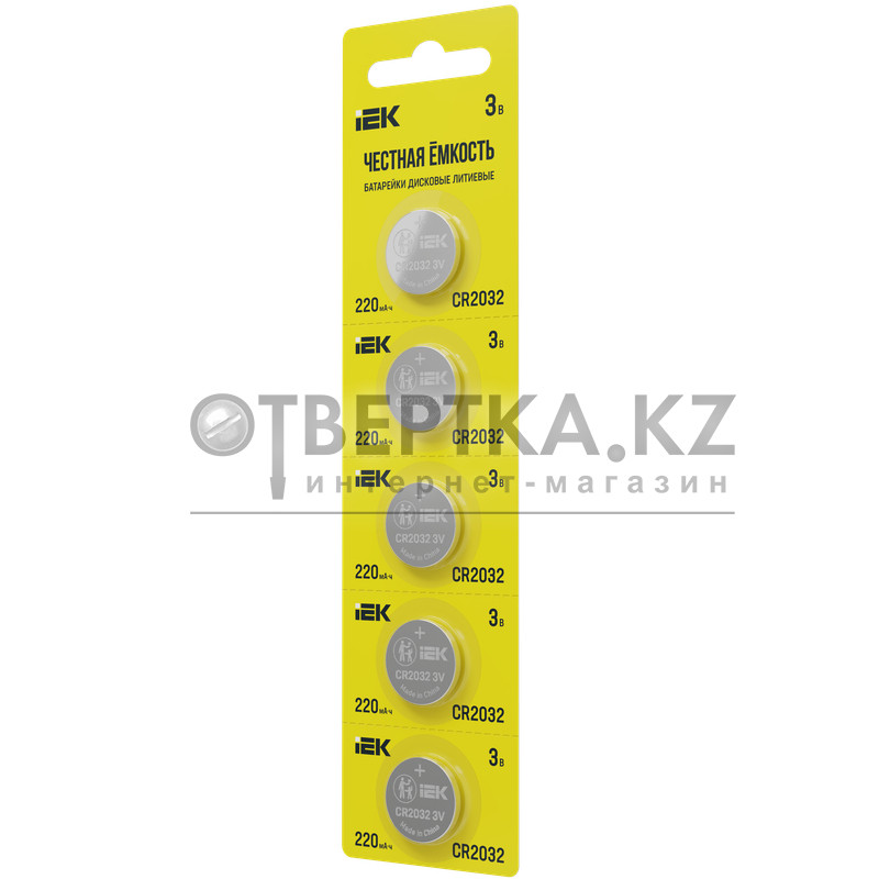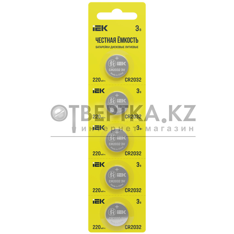 Батарейка дисковая литиевая IEK CR2032, 5 шт. на блистере. IEK применяет технологии, которые позволяют создать батарейки с длительным временем работы и стабильным качеством. Батарейки «Честная ёмкость» производятся в соответствии с международным стандартом IEC и проходят двойной контроль качества каждой партии. Батарейка подходит для использования в весах, гирляндах, калькуляторах, автомобильных ключах и брелоках автосигнализаций, пультах ворот и шлагбаума, часах, трекерах, материнских платах компьютера или ноутбука, глюкометрах, пульсометрах, термометрах и других устройствах. Соответствует ГОСТ 12.2.007.12, ГОСТ Р МЭК 55086-1 (IEC 55086-1).