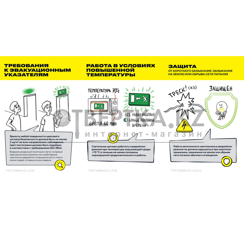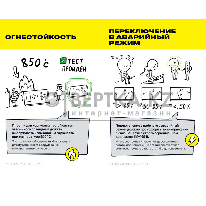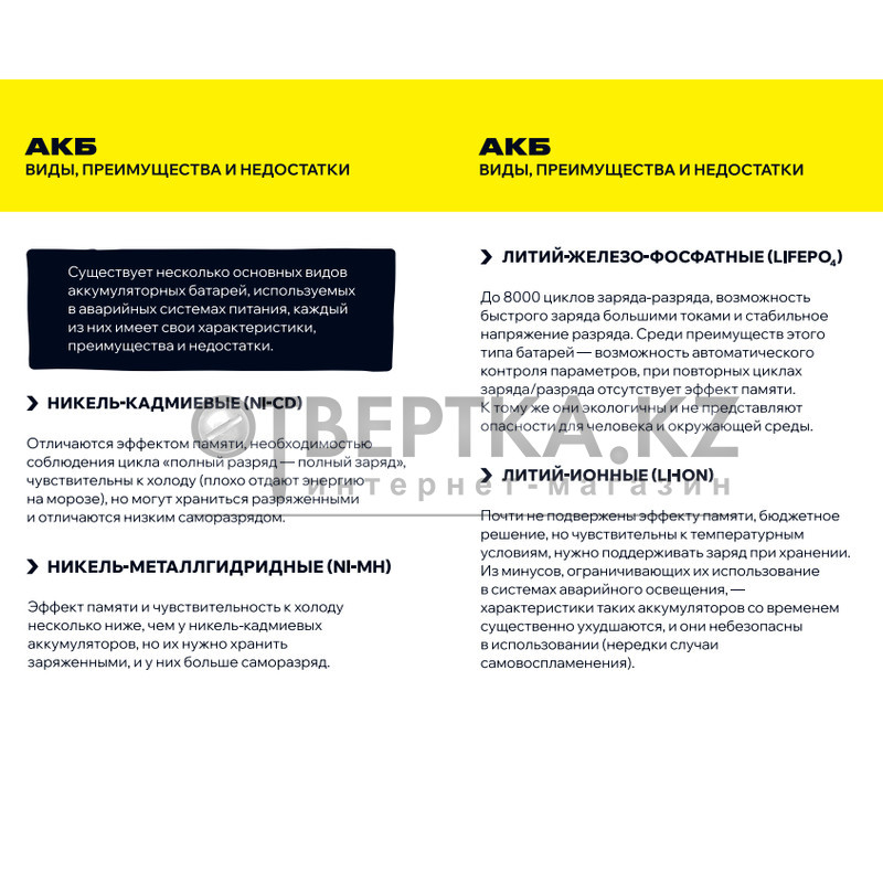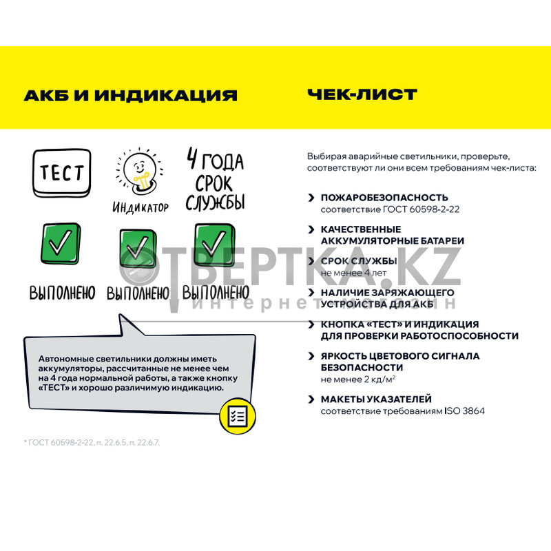 • Встроенная функция - AUTO TEST (ежегодный и ежемесячный автоматический запуск и проверка работоспособности светильника и аккумулятора - при возникновении проблем загорится ЖЕЛТЫЙ индикатор).