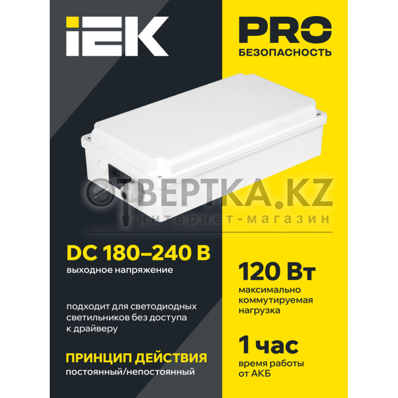 Универсальный блок аварийного питания предназначен для питания постоянным напряжением 220В светильников с драйвером различного типа и назначения, что позволяет преобразовать любой светильник в светильник аварийного назначения с полноценным резервным освещением в течении 1 часа работы от аккумулятора. Блок расположен в выносном влагозащищенном боксе со степенью защиты IP65. Максимальная мощность подключаемой нагрузки - 120Вт. К одному БАП может быть подключено несколько светильников.