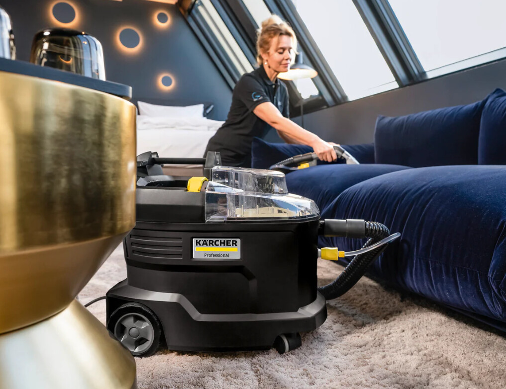 Пылесос для химчистки Puzzi 8/1 Anniversary Edition черного цвета впечатляюще очищает обивку и удаляет пятна с текстильных поверхностей с выдающимися и гигиеничными результатами очистки и высокой эффективностью. Компактный очиститель с распылением распыляет чистящий раствор глубоко в волокна текстиля, а затем всасывает его обратно вместе с удаленной грязью. Эффективная производительность обратного всасывания гарантирует, что текстильные поверхности быстро высохнут и по ним вскоре снова можно будет ходить. Это делает очиститель с распылением подходящим для высоких требований профессионалов в сфере клининга в гостиничном и ресторанном бизнесе или при чистке салонов автомобилей. Стандартная, очень короткая насадка для обивки облегчает уборку в труднодоступных местах. Благодаря малому весу и эргономичной ручке для переноски прочный очиститель с распылением можно легко переносить одной рукой. Большие кнопки, которыми можно управлять рукой или ногой, также повышают удобство для пользователя. Крышка прибора и ручная насадка прозрачны для лучшего обзора грязной воды. В комплект поставки юбилейного издания также входят 16 таблеток чистящего средства RM 760 CarpetPro Cleaner iCapsol.