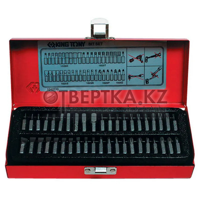 Набор бит KING TONY 1/4" TORX, HEX, PZ, PH, SLOT, SQ 42шт. 1042CQ - составленный из слесарного ручного инструмента профессионального качества, предназначен для использования мастерами на станциях технического обслуживания автомобилей (СТОА), а также автовладельцами в частных гаражах.