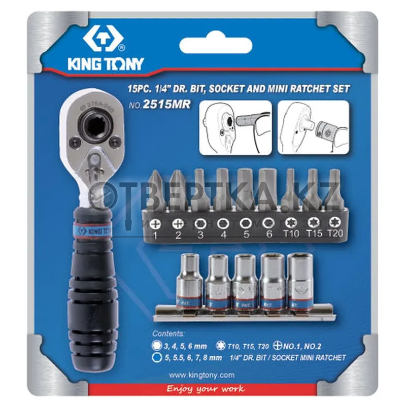 Набор бит и головок с трещоткой KING TONY 15шт. 2515MR - набор многофункционален и используется для монтажа/демонтажа различных резьбовых соединений в ходе слесарно-монтажных работ.