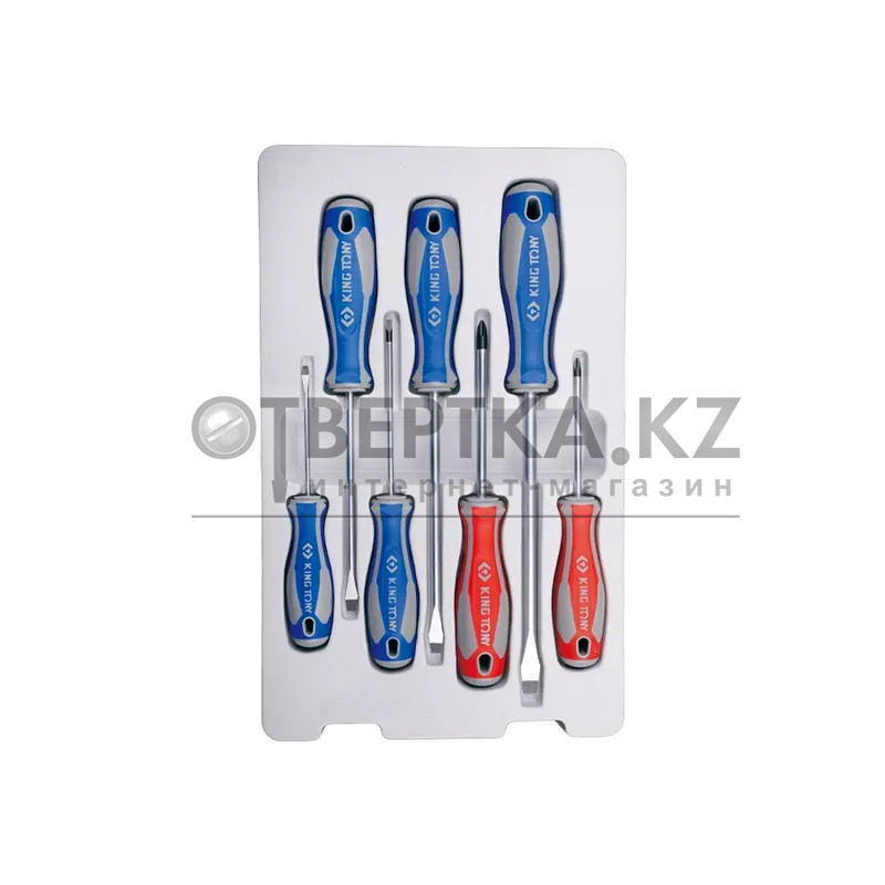 Набор отверток KING TONY 7 предметов 30117MR - это универсальный ручной инструмент, который применим как дома, так и в мастерской для работы с крепежными узлами. Комплект состоит из 7 отверток, двух крестовых и пяти шлицевых. Рабочая часть инструмента выполнена из хромованадиевой стали и прошла процесс термической обработки поверхности, что увеличивает ее прочность. Двухкомпонентные рукоятки отличаются стойкостью к маслам, кислотам и другим химическим веществам.