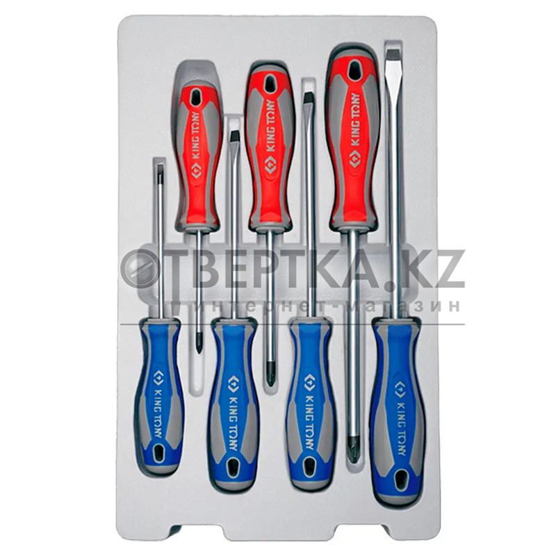 Набор отверток KING TONY 7шт. 30127MR - применяется для сборочных и ремонтных работ в быту и профдеятельности. В набор входит 4 плоские РН и 3 крестовые отвертки PZ самых популярных типоразмеров и длин. Изделия оснащены эргономичными рукоятками и прочными стальными стержнями. Отвертки не подвержены появлению коррозии и прослужат долгий срок.