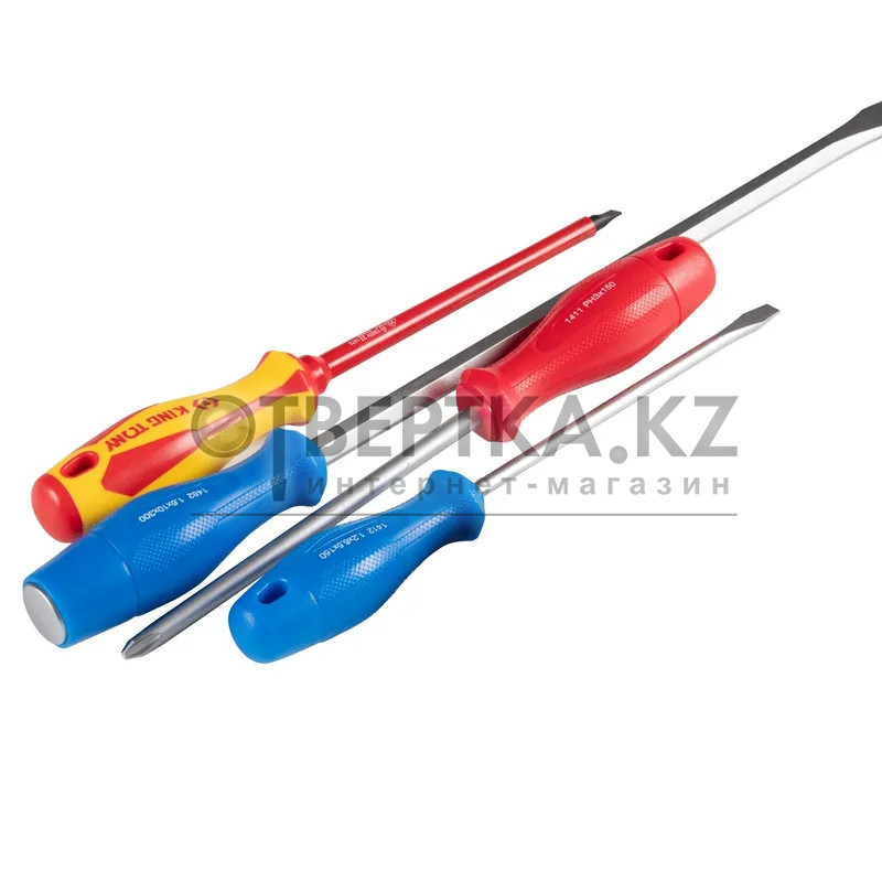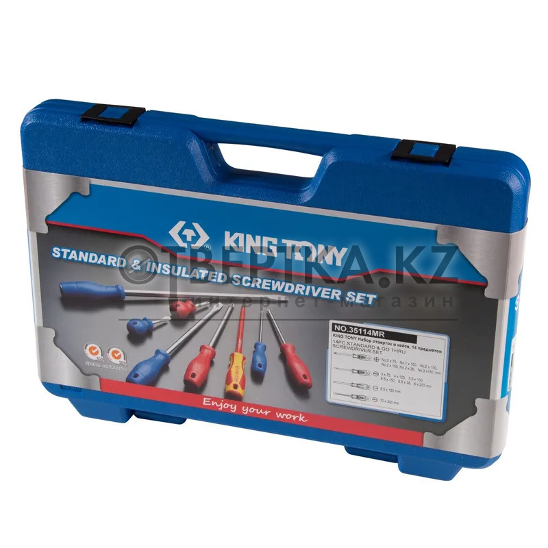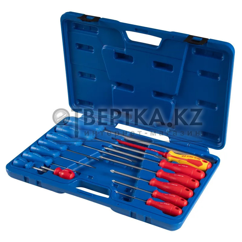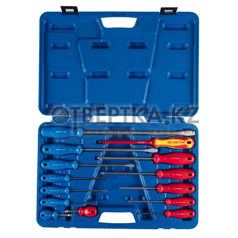 Набор отверток в кейсе KING TONY 14 предметов 35114MR - включает в себя большое количество инструментов для работы с автомобильным крепежом. Все отвертки выполнены из качественного материала, что гарантирует их долгий срок службы. Два замка исключают случайное открытие кейса в дороге. Отвертки серий 1411, 1412 и 1482 выполнены из полипропилена, серии 1472 - из полипропилена и термопластичной резины.