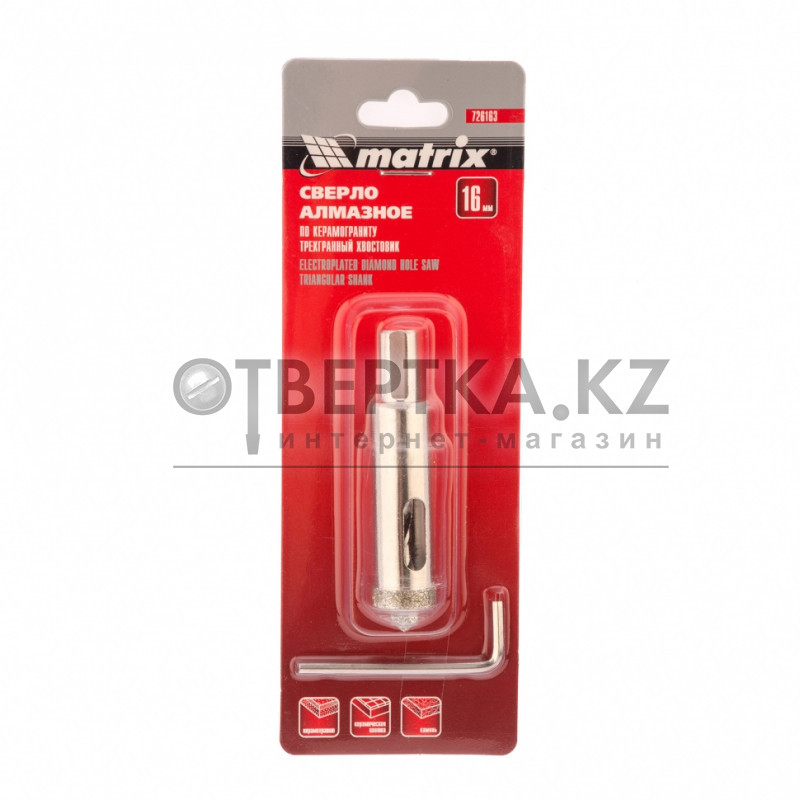 Универсальное алмазное сверло по керамограниту Matrix 726163 размером 16 х 67 мм, с 3-гранным хвостовиком, применяется для получения отверстий в стекле, плитке, кафеле. За счет высокой концентрации алмазов в режущем слое оно легко справляется со сверлением керамогранита. Сверло рассчитано на профессиональное использование с дрелями и шуруповертами. Водяное охлаждение в процессе работы значительно повышает срок службы оснастки.