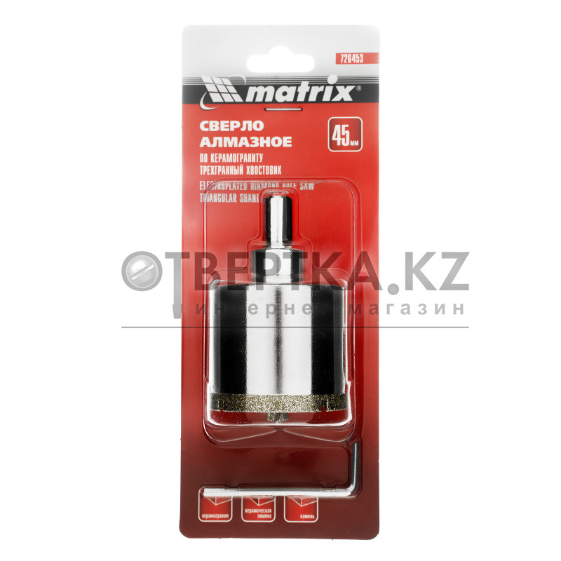 Универсальное алмазное сверло по керамограниту Matrix 726453 размером 45 х 67 мм, с 3-гранным хвостовиком, применяется для получения отверстий в стекле, плитке, кафеле. За счет высокой концентрации алмазов в режущем слое оно легко справляется со сверлением керамогранита. Сверло рассчитано на профессиональное использование с дрелями и шуруповертами. Водяное охлаждение в процессе работы значительно повышает срок службы оснастки.