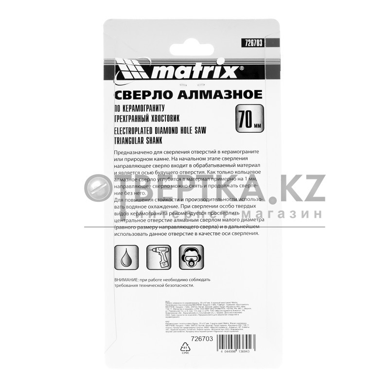 Универсальное алмазное сверло по керамограниту Matrix 726703 размером 70 х 67 мм, с 3-гранным хвостовиком, применяется для получения отверстий в стекле, плитке, кафеле. За счет высокой концентрации алмазов в режущем слое оно легко справляется со сверлением керамогранита. Сверло рассчитано на профессиональное использование с дрелями и шуруповертами. Водяное охлаждение в процессе работы значительно повышает срок службы оснастки.