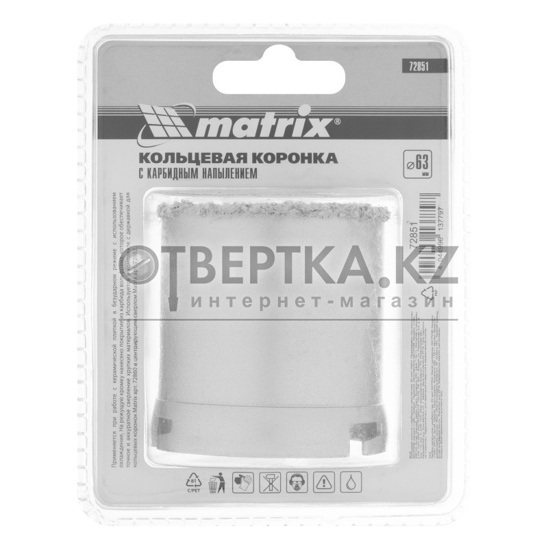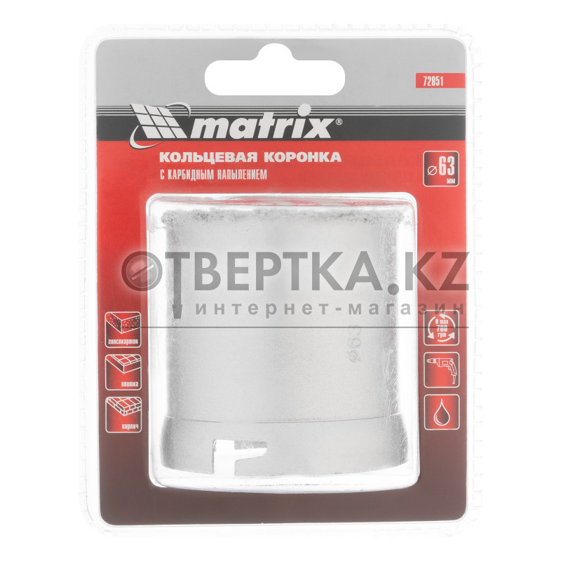 Кольцевая коронка с карбидным напылением Matrix 72851 диаметром 63 мм — сменный режущий элемент для дрелей и перфораторов. Предназначена для сверления отверстий в керамической плитке, ячеистом бетоне, пенобетоне, газосиликате, кирпиче. Пригодится для монтажа проводки в доме. Используется совместно с державкой Matrix 72860 и центрирующим сверлом Matrix 72862 (не входят в комплект поставки).
