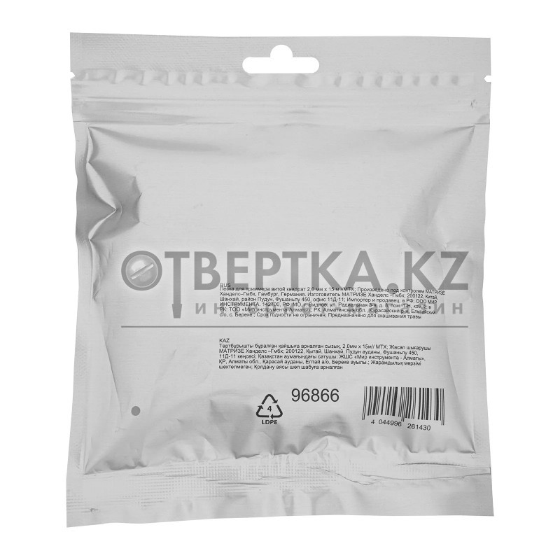 Леска для триммера MTX 96866 с сечением «витой квадрат», толщиной 2,0 мм и длиной 15 м, позволяет быстро и эффективно скашивать газонную, а также высокую и жесткую траву. Заправляется в катушку электрических триммеров мощностью 1000-1500 Вт. Пригодится для ухода за загородным участком.
