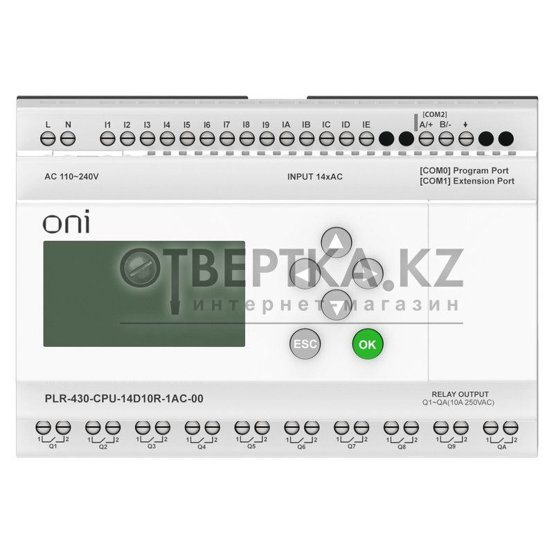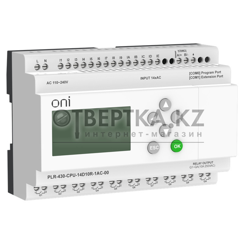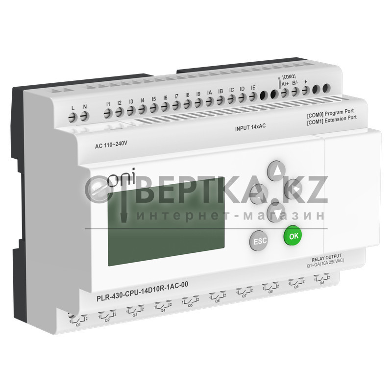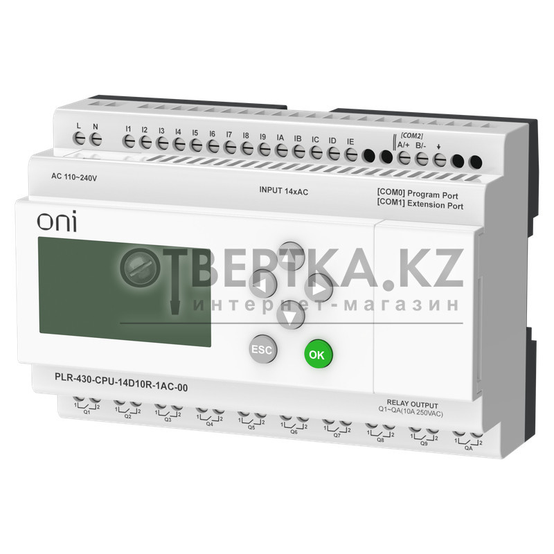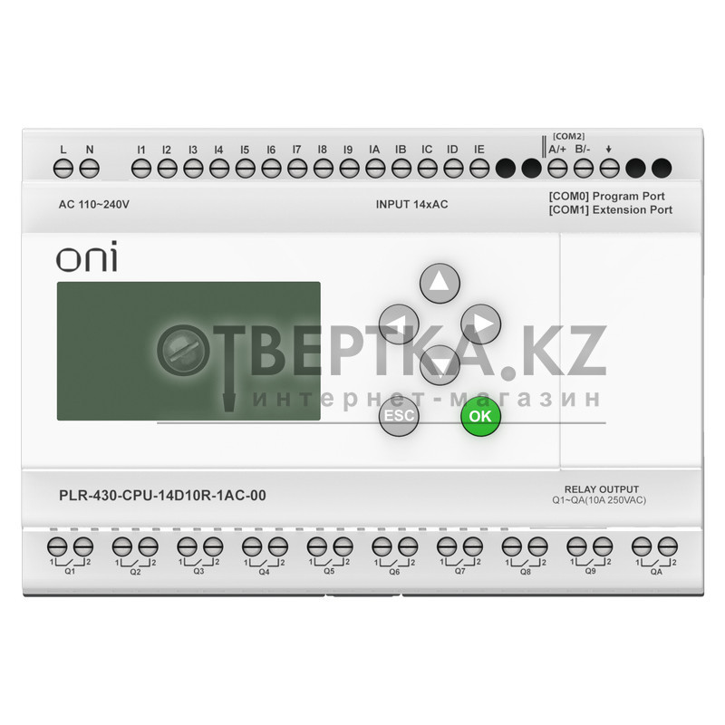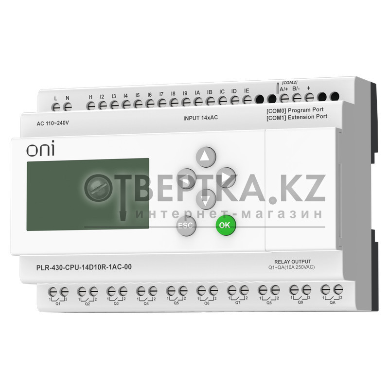 Модуль ЦПУ ПЛК 430 ONI с возможностью расширения количества каналов ввода-вывода и коммуникаций с помощью модулей расширения. С интегрированным полнофункциональным экраном. 14 дискретных входов, 10 релейных выходов. Интегрированы 1 интерфейс RS485 и 1 интерфейс RS232. Напряжение питания 220В AC.