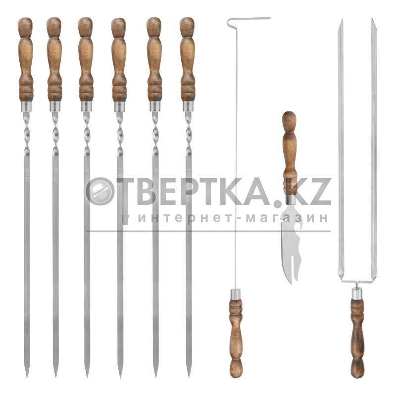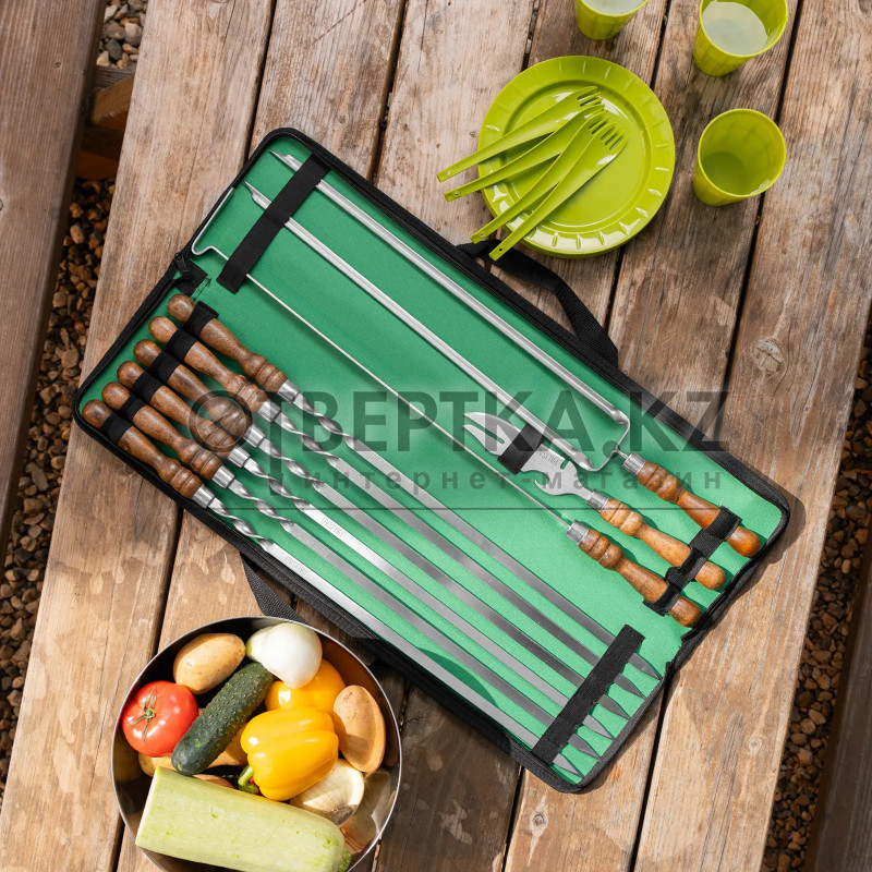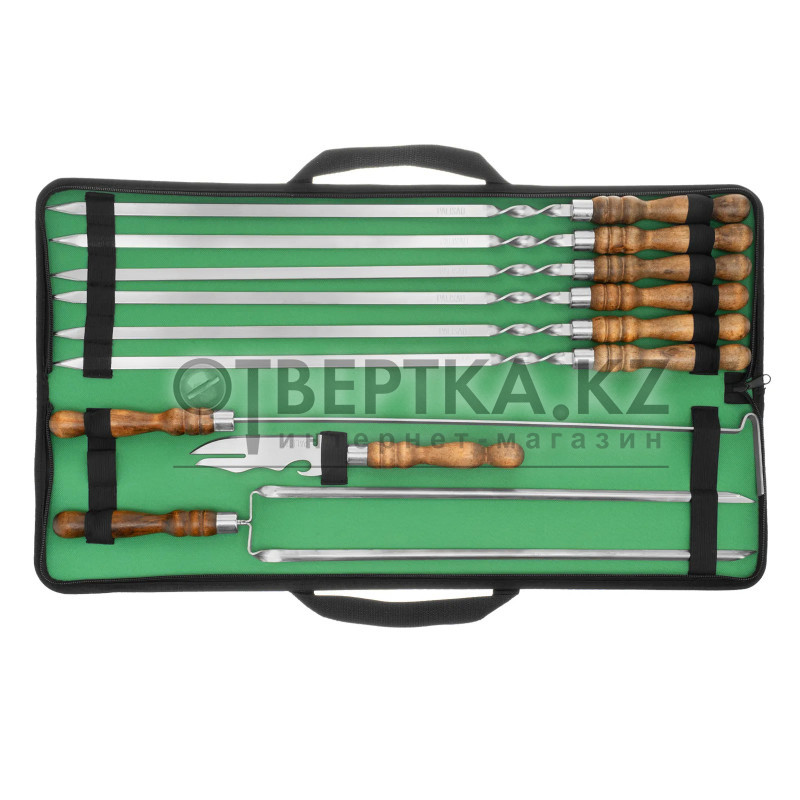 - Прочность и долговечность — элементы набора изготовлены из нержавеющей стали, шампуры увеличенной толщины 2,5 мм не сгибаются и не деформируются под тяжестью продуктов.