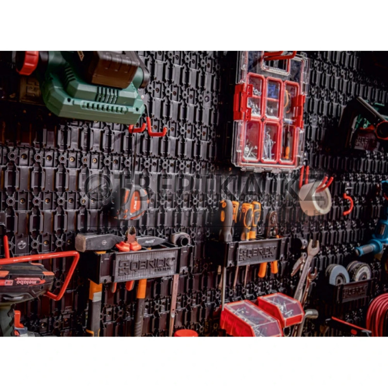 - Постоянное заклёпочное соединение Custom Connector гарантирует надёжное крепление к коробкам Qbrick, стенам и перфорированной панели QS Custom Pegboard.