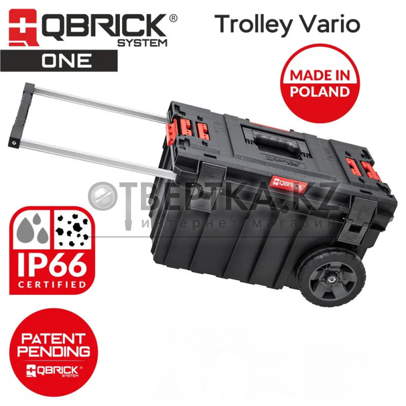 QBRICK SYSTEM ONE TROLLEY VARIO 605 x 405 x 345, SKRWQONETVCZAPG003 — большой ящик для инструментов на колесах, обеспечивающий превосходную мобильность модульных систем Qbrick. Два опорных колеса на металлической оси гарантируют безопасную транспортировку наборов коробок и органайзеров. Мобильный ящик позволяет хранить и перевозить длинные электроинструменты, такие как отбойные молотки, угловые шлифмашины или строительные миксеры вместе с принадлежностями. Выдвижная сбоку телескопическая алюминиевая ручка обеспечивает удобный доступ внутрь бокса и позволяет легко переносить бокс вместе с другими элементами линейки ONE, скрепленными соединителями полиамида. Простой механизм выдвижной рукоятки на двойном телескопе фиксируется на месте при легком ударе снизу. Содержимое снабжено удобным лотком и гибким уплотнителем, предохраняющим инструменты от пыли и воды. Усиленная конструкция крышки и корпуса гарантирует высокую грузоподъемность — до 50 кг.