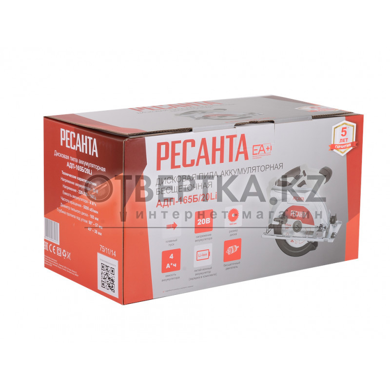 Дисковая пила аккумуляторная Ресанта АДП-165Б/20Li ЕА+ 75/11/14 (1x 4.0 Ач, 20 В, 165x20 мм)