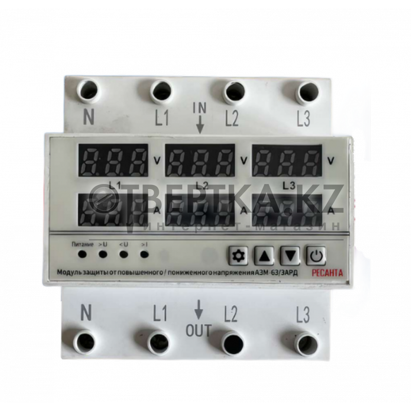 Автоматический защитный модуль Ресанта АЗМ-63/3АРД регулируемый (с дисплеем) - автоматическое устройство защиты от повышенного/пониженного напряжения, в основном используемое для низковольтных распределительных линий для бытовых и аналогичных целей, автоматически обнаруживает сбой, связанный с повышением или понижением напряжения, и отключает нагрузку. При восстановлении нормальных условий на линии, автоматически включает нагрузку. Включение и выключение происходит за счет трех электромагнитных реле.