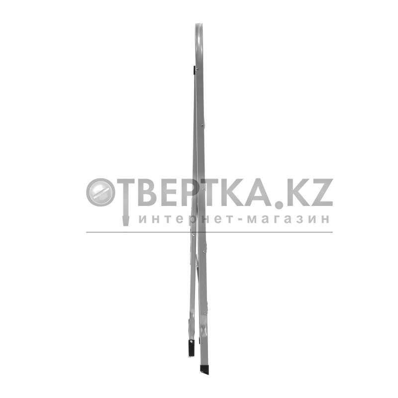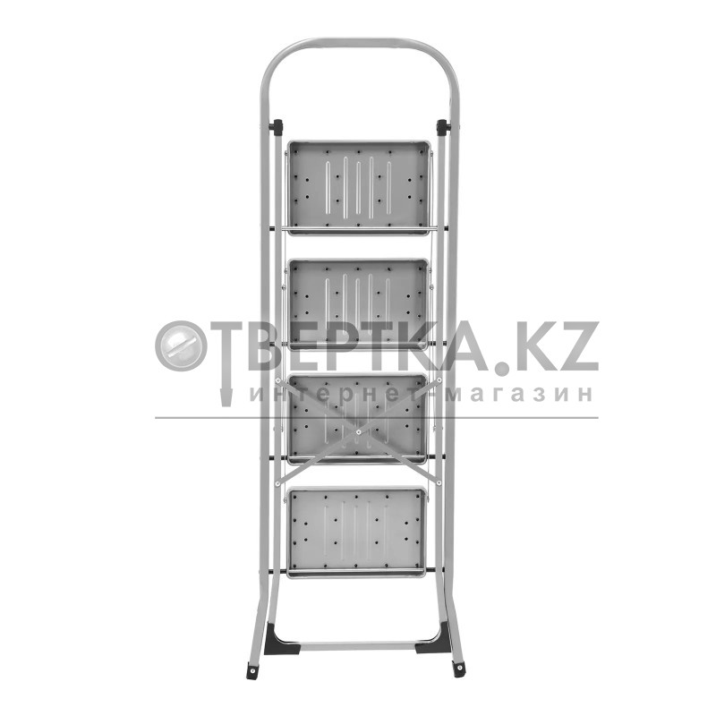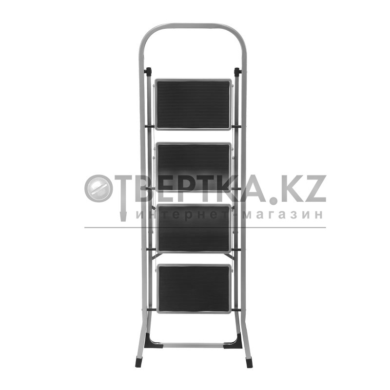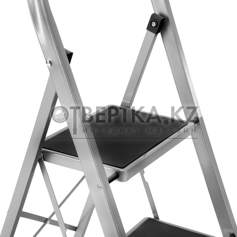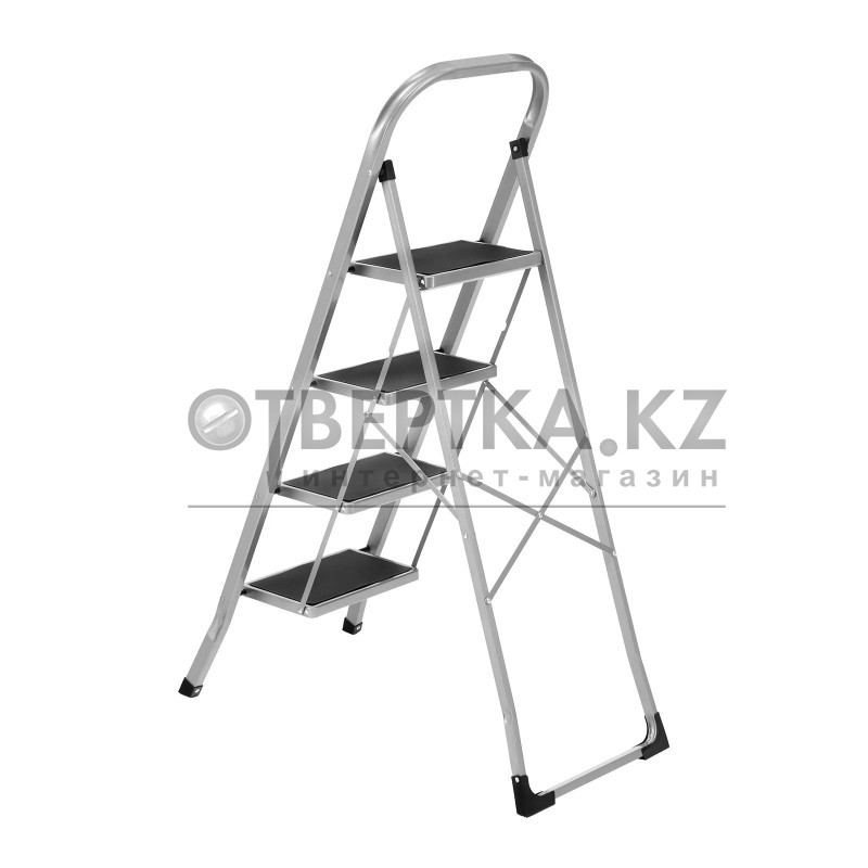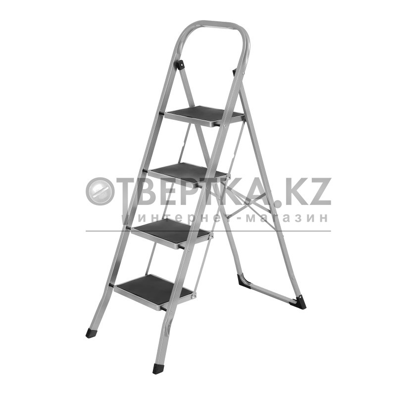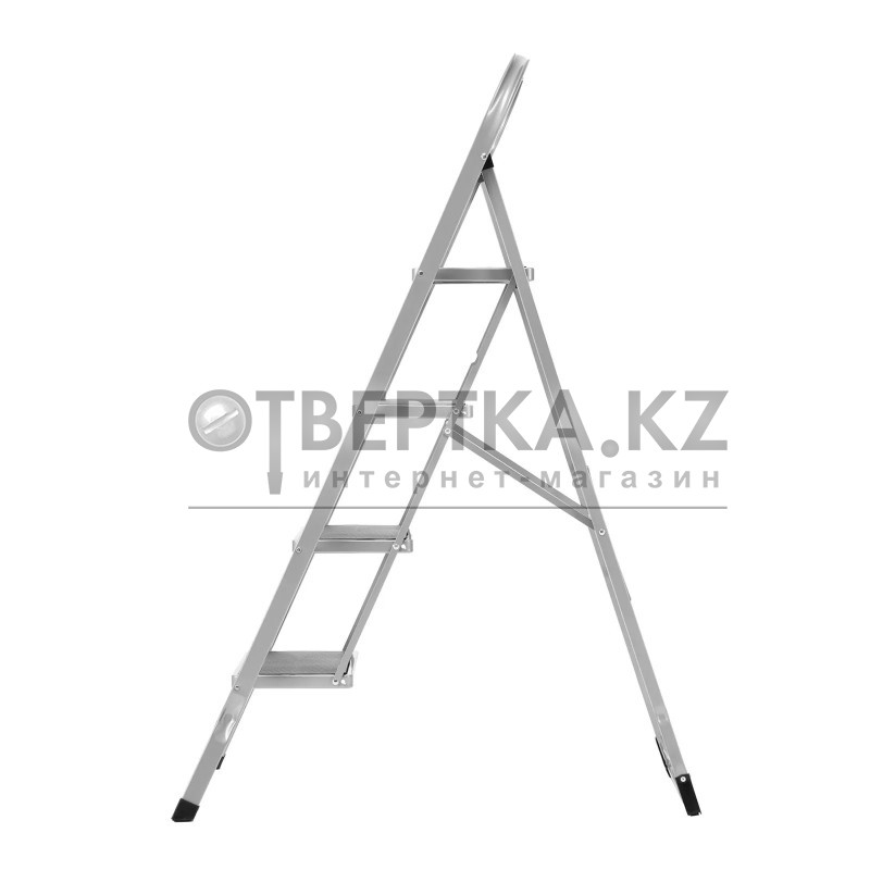 - Прочная конструкция — стремянка изготовлена из стального профиля и снабжена надежным механизмом раскладывания, поэтому выдерживает нагрузку до 150 кг.