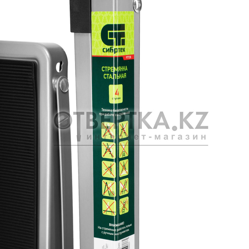 Стальная стремянка Сибртех 97728 с 4 широкими ступенями размером 20 x 30 см, с полимерным покрытием, позволяет выполнять различные работы на высоте, превышающей человеческий рост. С ее помощью можно достать нужный предмет с полки, покрасить стену, поменять лампочку, вытереть пыль на шкафу и т.д. Верхняя ступень находится на высоте 88 см от опорной поверхности, рабочая высота составляет 288 см (при среднем росте пользователя 170 см). Дуга безопасности и широкие ступени с нескользящим покрытием обеспечивают устойчивое положение пользователя. Стремянку следует размещать на ровной поверхности и использовать для работы только с ручным инструментом.