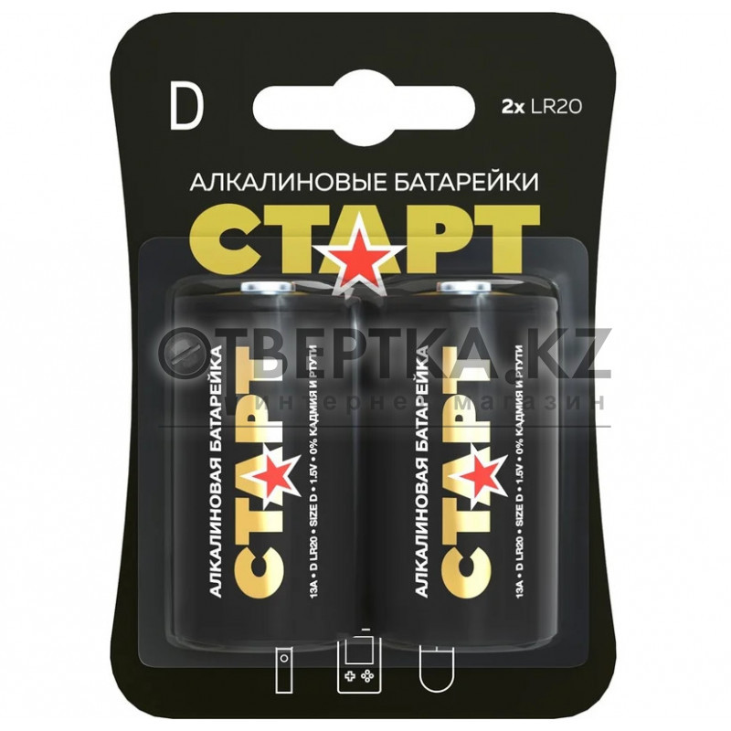 Комплект из 2-х батареек из серии наиболее крупных по габаритам («цилиндрический» типоразмер D) элементов питания от известного российского производителя СТАРТ, работающих на маргонцево-цинковом принципе и обладающих повышенной энергоёмкостью. Заряд алкалиновых батареек расходуется равномерно на протяжении всего срока их службы. Поэтому Ваши приборы не перестанут работать внезапно, в самый критический момент – к примеру, карманный фонарь в тёмном лесу.
