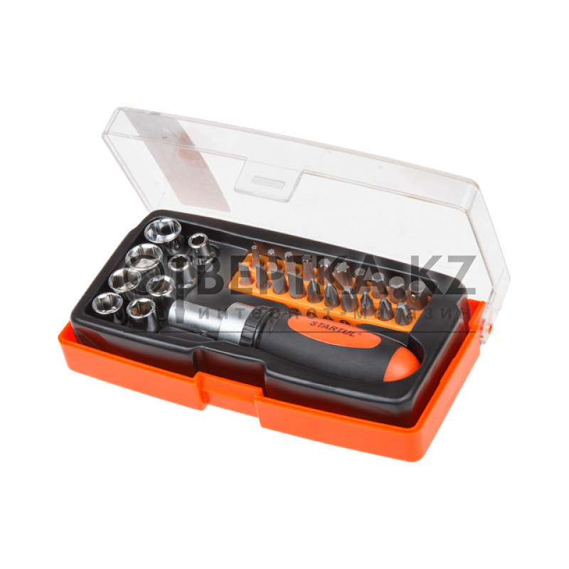 Комплект: отвертка реверсивная с магнитным наконечником (1шт), переходник 25мм (1шт), головки (8шт) 5-6-7-8-9-10-11-12мм, биты 25мм (19шт) SL4-5-6-7 / Hex4-5-6 / PH#1-#2-#3 / PZ#1-#2-#3 / Torx T10-T15-T20-T25-T30-T40,