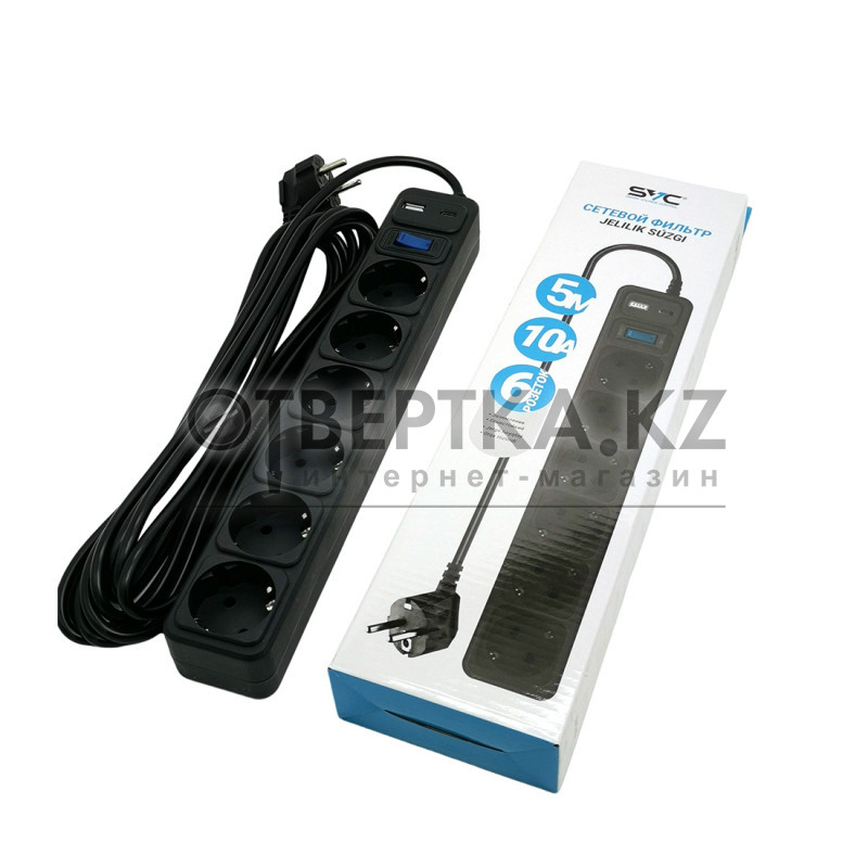 Сетевой фильтр, SVC, ZC6S-50M-USB/TypeC, 6 розеток, 5 метров, один USB-порт и один Type-C-порт, 220–250 В, 10 A, картонная коробка, чёрный SVC предназначен для подключения электроприборов в местах, удалённых от стационарных розеток. Розеточный блок изготовлен из ударопрочной пластмассы и оснащён одним USB-портом и одним Type-C-портом. Обеспечивает защиту подключённой техники от перегрузок по току, короткого замыкания, а также высокочастотных и импульсных помех.