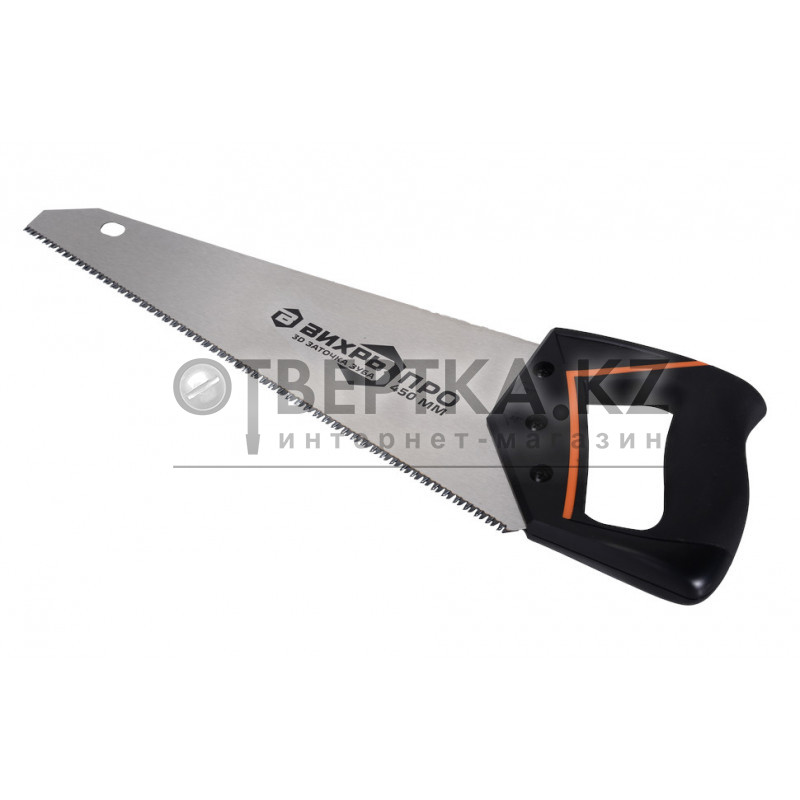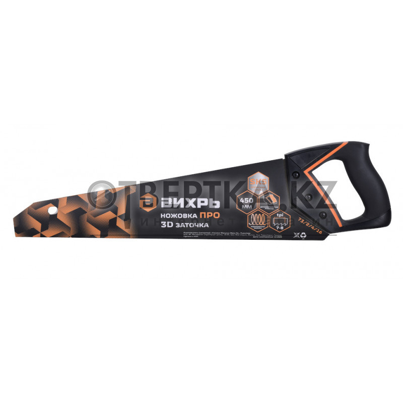Ножовка ПРО 450 мм 3D заточка SK5 полотно 2 комп.рукоятка Вихрь предназначена для столярных и плотницких работ, пригодится во время ремонта и будет полезна в быту. Рез вдоль и поперек волокон всех видов материалов. Профессионально пилит древесину, фанеру, ДСП.