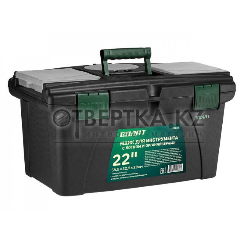 Ящик предназначен для хранения и удобной транспортировки инструментов. Подвижный лоток и два съемных органайзера на крышке позволяют разместить необходимые инструменты и аксессуары. Ящик надежно закрывается с помощью защелок.