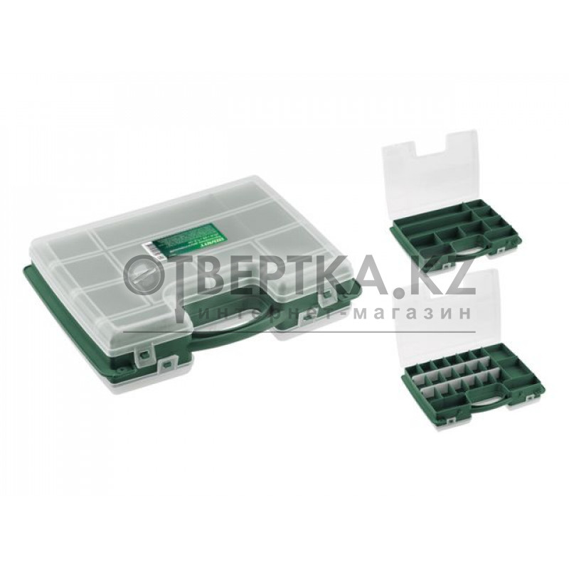 Пластиковый двухсторонний ящик выполнен в форме кейса, переставные перегородки, на одной стороне 22 отделения, на другой - 10 отделений. Служит для хранения и переноски крепежных и других мелких изделий. В нем удобно размещаются необходимые аксессуары и различные мелочи. Прозрачная крышка позволяет видеть расположение крепежа внутри.
