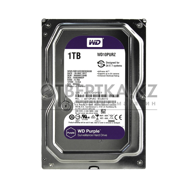 Жёсткий диск для видеонаблюдения Western Digital Purple HDD 1Tb WD10PURZ (Жёсткий диск для видеонаблюдения, Western Digital, WD10PURZ Purple, HDD 1Tb, SATA 6Gb/s, 64Mb 3,5")