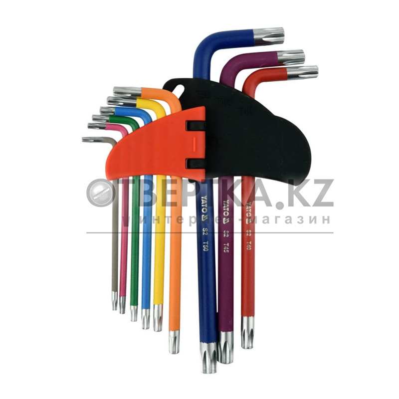 YATO YT-05633 — набор цветных Г-образных ключей TORX с отверстием в торце (Torx Tamper Resistant — TR), предназначенный для работы с антивандальными крепежными соединениями. Модель выполнена из прочной инструментальной стали S2 с твердостью 58–62 HRC, обеспечивающей долговечность, эластичность и устойчивость к износу. Цветная маркировка позволяет быстро подобрать нужный размер и облегчает организацию работы.