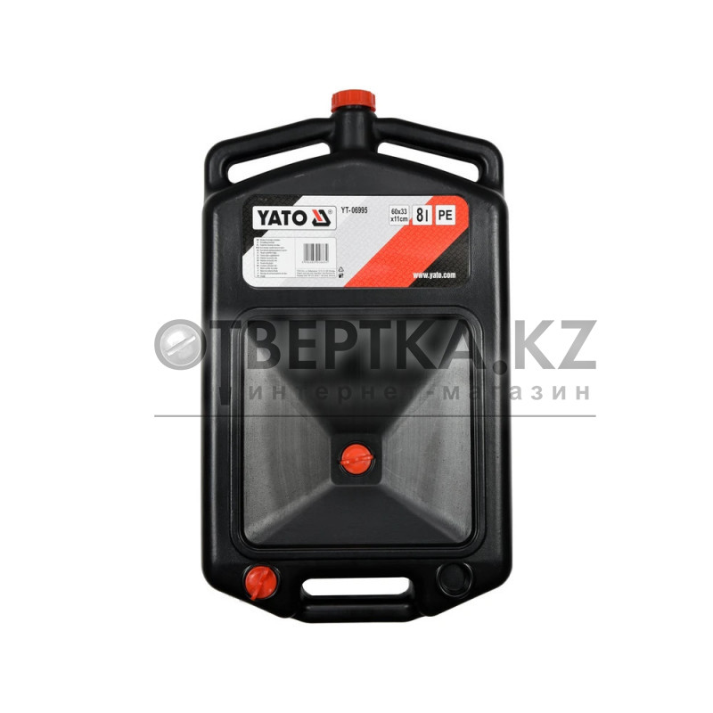 - Контейнер для слива масла YATO, объём 8 л, с выпускным отверстием и эргономичными ручками.