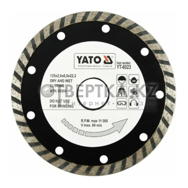 Круг алмазный отрезной универсальный YATO YT-6023 — сменный элемент угловых шлифмашин, предназначенный для работы с различными материалами, такими как бетон, кирпичная кладка, керамическая плитка, гранит, природный камень, мрамор и другие. Диск обеспечивает быстрый, чистый и точный рез при максимальных оборотах (8000 об/мин), как для сухих, так и для мокрых работ. Он подходит для работы с различными материалами и является отличным инструментом для профессионалов.