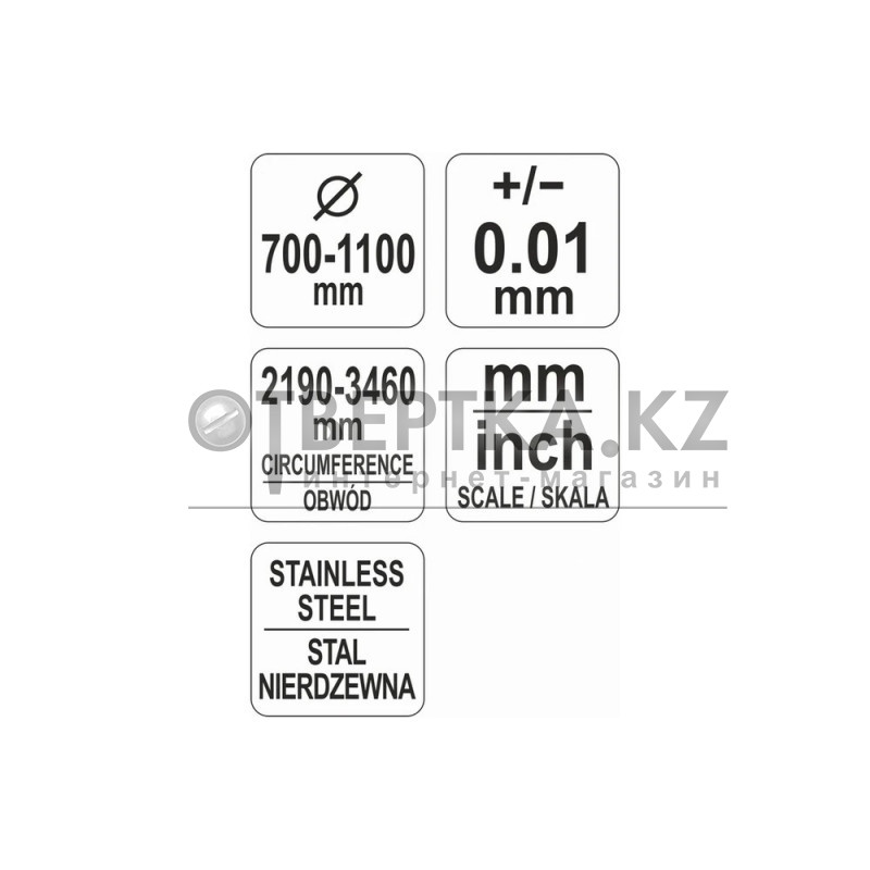Прецизионная лента для измерения диаметра и окружности. Диапазон измерения - диаметр 700-1100 мм, окружность 2190-3460 мм, точность измерения 0,1 мм. Материал - нержавеющая сталь.