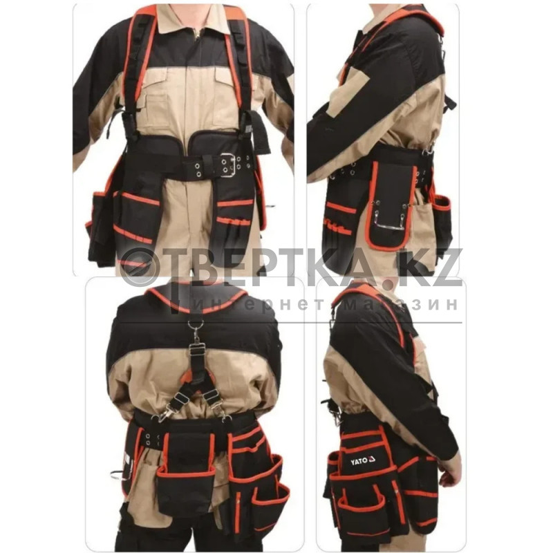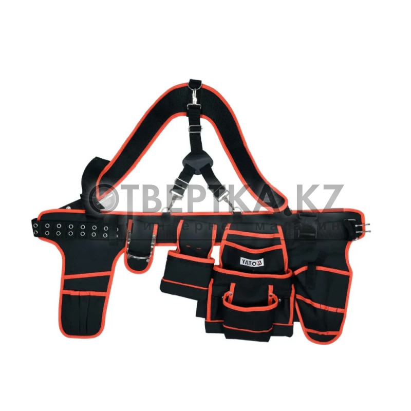 Инструментальный пояс с лямками YATO YT-74071 — инструментальный пояс с ремнями безопасности, двумя большими чехлами для электроинструментов, металлическим держателем молотка и глубоким карманом для гвоздей или шурупов. Выполнен из прочной технической водонепроницаемой полиэфирной ткани OXFORD 600D.