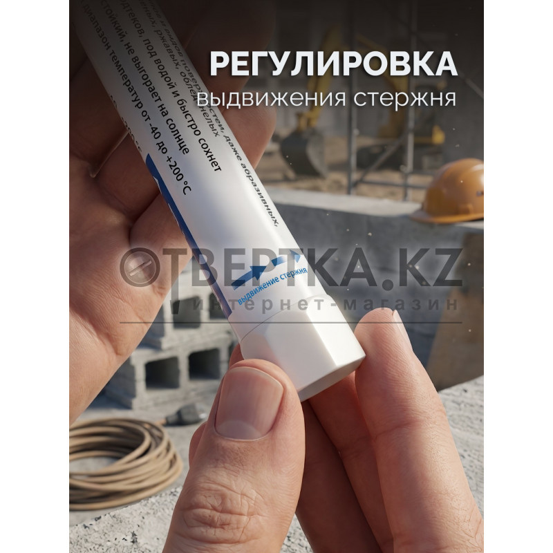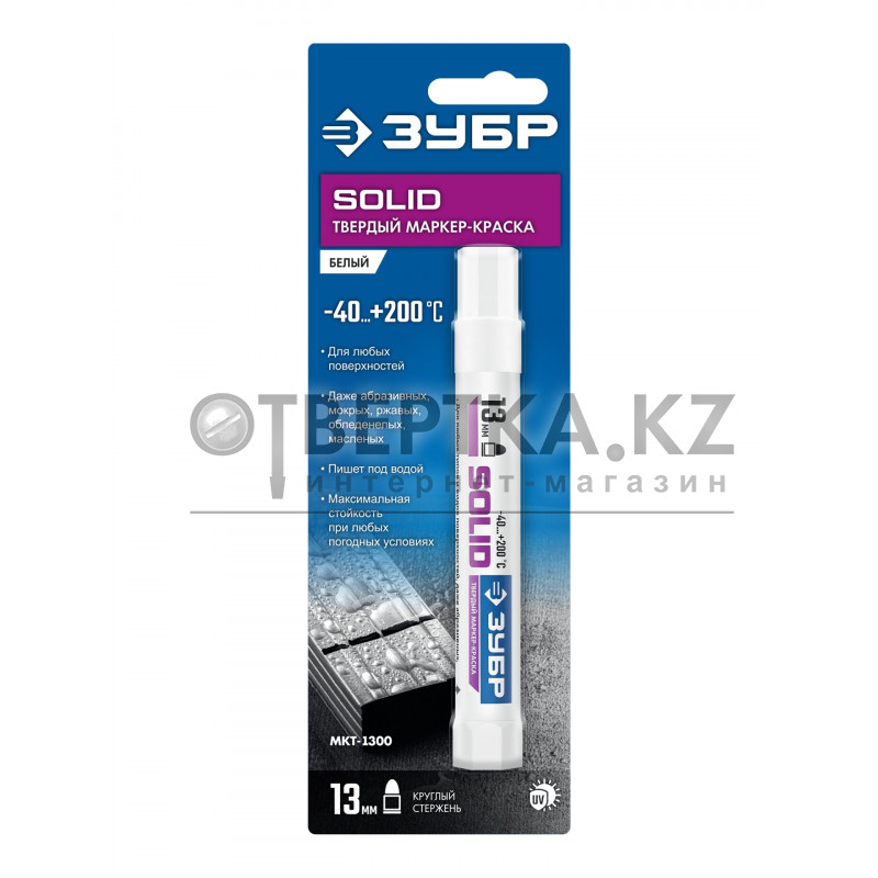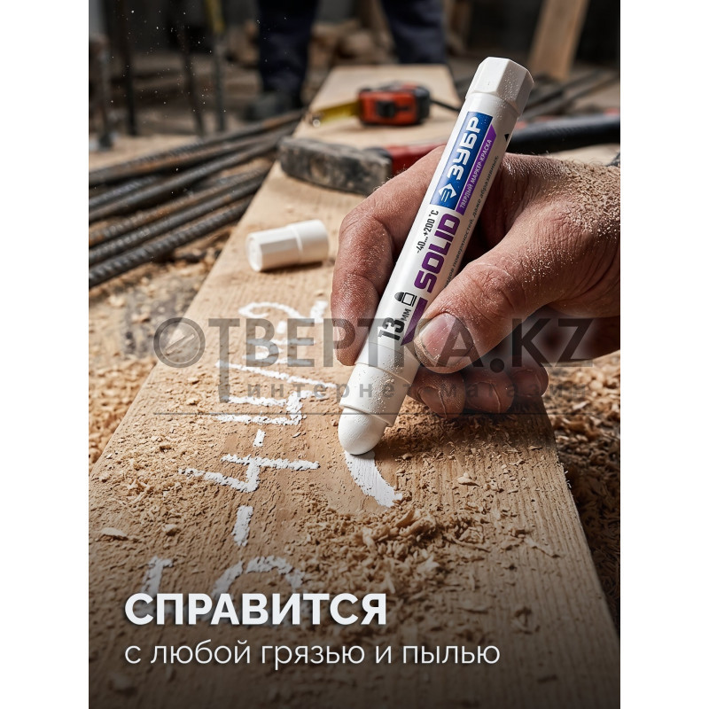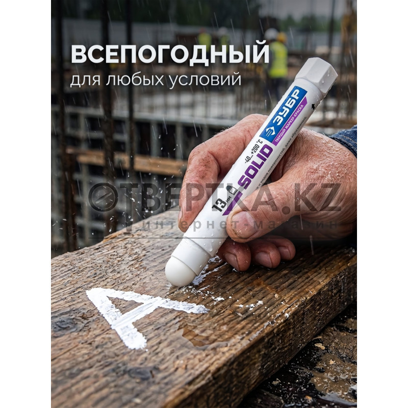 Маркер-краска твердый - профессиональный иснтрумент для разметки по любым поверхностям - гладким, шероховатым и грубым, чистым, пыльным, замаслянным и грязным, по сухим и влажным поверхностям, под дождем, снегом и даже под водой. Пастообразная краска в удобном корпусе. Подача производится механизмом внизу корпуса.