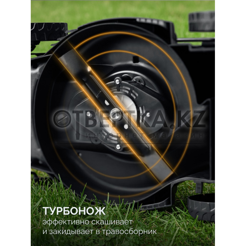 - ТурбоНож создаёт мощный поток воздуха, который поднимает полегшую траву для ровного скашивания и полностью собирает всю скошенную массу и листву