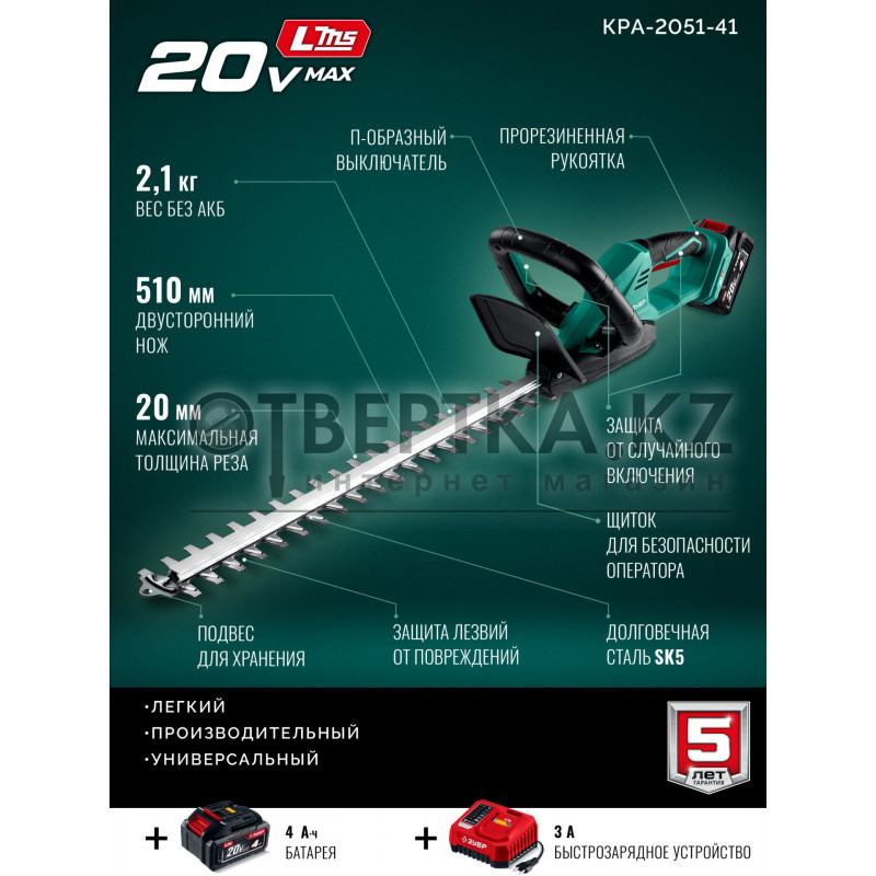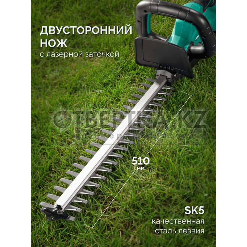 Аккумуляторный кусторез предназначен для ухода за живыми изгородями, стрижки кустарников и деревьев. Он может быть использован для выполнения как прямой, так и фигурной подрезки, превращая ваш сад в произведение искусства. Лезвия выполнены из японской стали SK5 и гарантируют быстрый рез и долгий срок службы. Комплектация с аккумулятором высокой емкости и быстрозарядным устройством позволяет приступить к работе сразу после покупки.