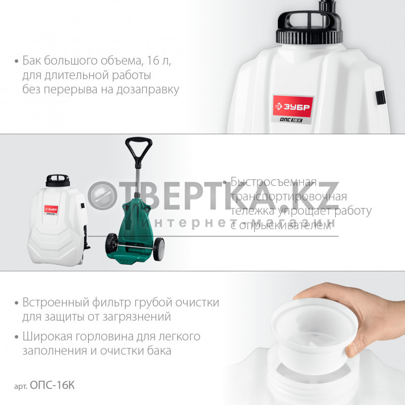 Ранцевый аккумуляторный опрыскиватель отличается эффективностью, мобильностью, экологичностью. Бережно орошает растения. Подходит для дезинфекции помещений и участков, мытья окон и стен, нанесения антисептиков и антипиренов. Работает от свинцово-кислотного аккумулятора. За счет наличия ремней обеспечивается удобство переноски на спине, а за счет тележки с колесами - легкость перемещения к месту проведения работ