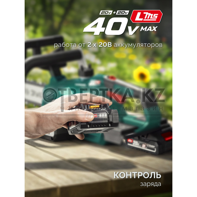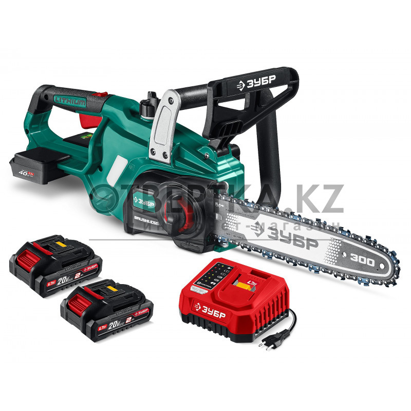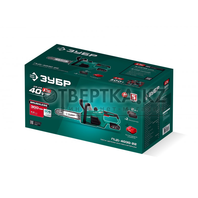 ЗУБР 40 В, (2x20В), 300 мм шина, 2 АКБ LMS (2 Ач), пила цепная аккумуляторная (ПЦБ-4030-22)