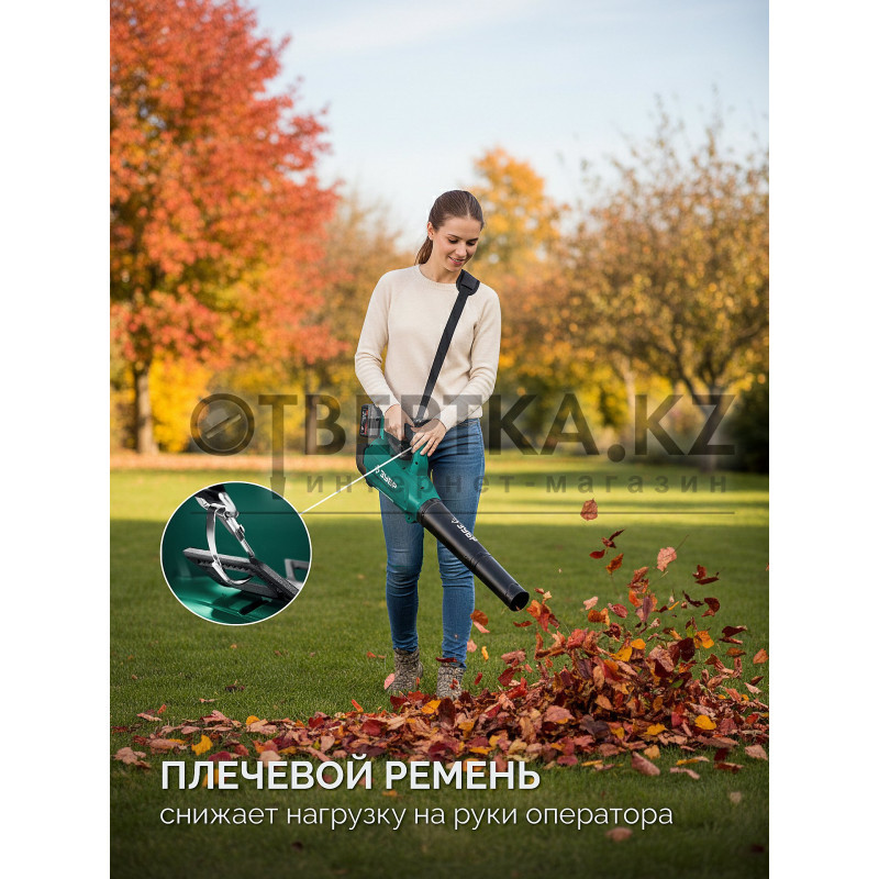 - Наплечный ремень снижает нагрузку на руки оператора, облегчая длительное ношение воздуходувки